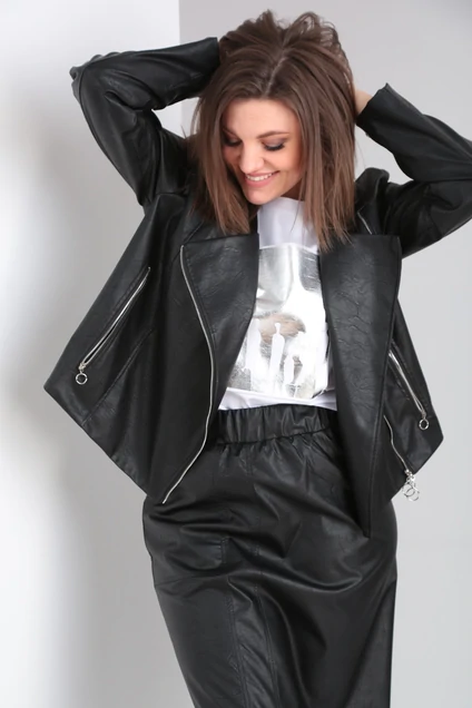 Куртка укороченная в стиле "косуха". Универсальная укороченная модель куртки сезон весна-лето-осень. Куртка необычного кроя выполнена из качественного плотного кожзама. У модели контрастная подкладка с принтом в полоску. На рукавах функциональные молнии. Застежка в куртке на молнию и кнопку. По спинке фигурная кокетка, которая подчеркнет талию. Длина модели идеально подходит к платьям, брюкам и возможно сочетать с любой обувью. На фото куртка представлена с различными моделями бенда GRATTO.