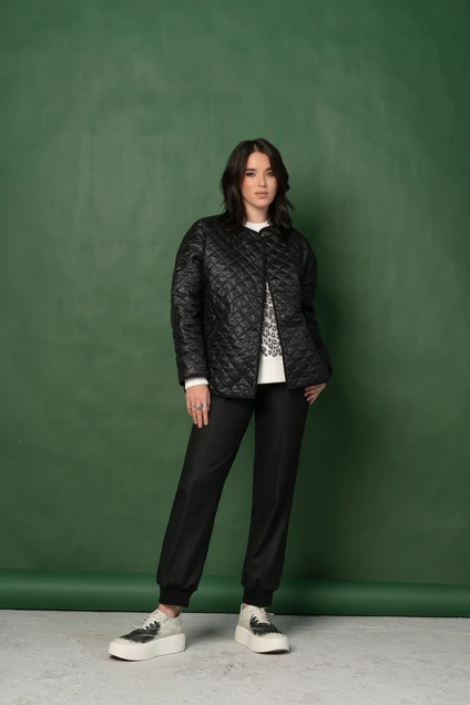 Куртка женская молодежная из ткани *лаке*простеганной квадратами 4*4 с синтепоном и подкладкой с центральной застежкой на 5 кнопок по переду.Прямого силуэта со спущенной линией плеча и рукавом длинной до запястья.По переду карманы ниже линии талии