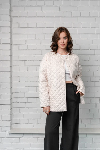 Куртка женская молодежная из ткани *лаке*простеганной квадратами 4*4 с синтепоном без подкладки с центральной застежкой на 5 кнопок по переду.Прямого силуэта со спущенной линией плеча и рукавом длинной до запястья.По переду карманы ниже линии талии