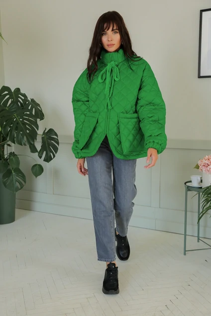 Застежка центральная на молнию. Линия плеча расширена. Воротник стойка. По полочке большие отлетные карманы.
