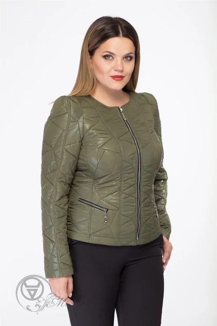 Куртка прилегающего покроя, стёганная вмесмте с  подкладкой . Вырез горловины округлый, без воротника.  На полочке карманы с молнией.