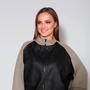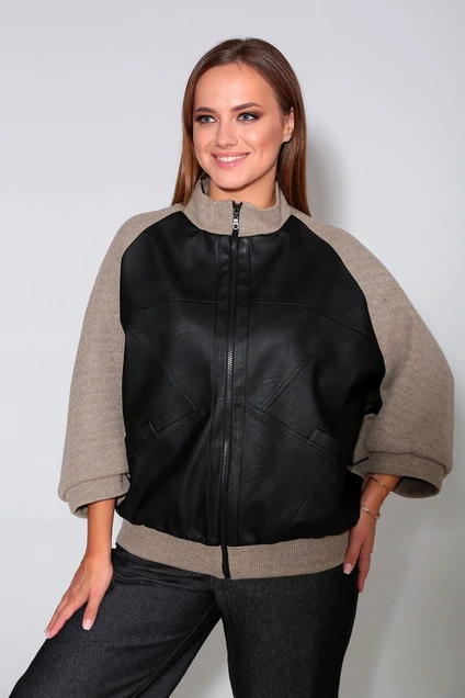 Куртка изготовлен из плотного вязанного трикотажа и эко-кожи. Застежка центральная на молнию. Рукав цельнокроеный ¾. На подкладке.