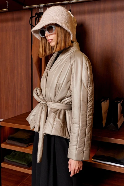 Куртка прямого силуэта. Рукав реглан, двухшовный- с верхним и нижним швом, длинный. Длина куртки чуть выше линии бедер. Застежка центральная, на кнопки. Воротник- шаль, переходящий в стойку. Линия талии фиксируется съемным поясом.