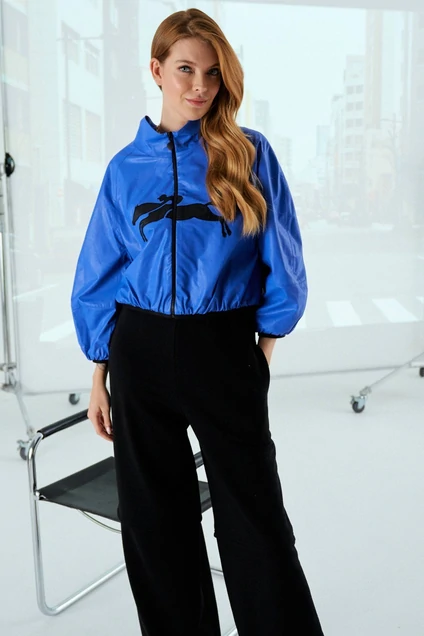 Куртка свободного силуэта из экокожи, на подкладке. Рукав реглан 3/4, объёмный с подрезом в области локтя, низ у рукава сосборен на эластичную тесьму. По горловине воротник стойка, застёжка на молнию. По переду аппликативная вышивка из экокожи, низ куртки сосборен на эластичную тесьму.