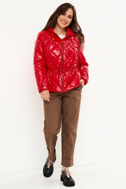 Стильная осенняя куртка прямого кроя, на синтепоне, с центральной застежкой на металлическую молнию. Дополнена функциональными карманами и несъемным капюшоном. Куртку можно приталить за счет кулиски с тесьмой, выполненной из основной ткани. Длина куртки от плечевого шва 65см. Длина рукава 62см.