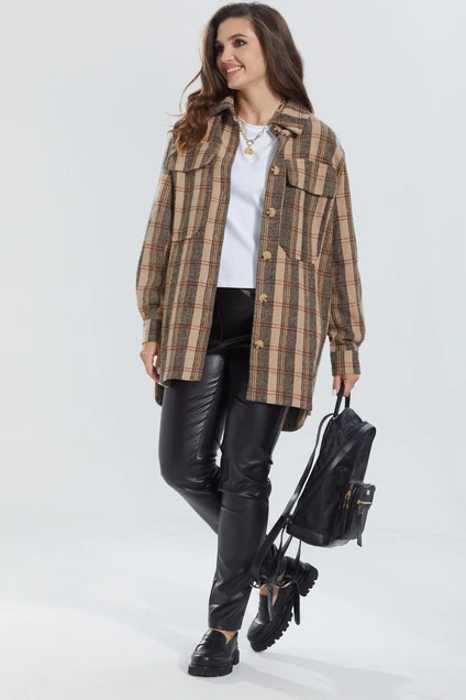 Куртка прямого силуэта, однобортная, в боковых швах обработаны закруглённые разрезы. На груди два накладных кармана с клапанами. Воротник рубашечный с отрезной стойкой. Рукав рубашечный с манжетой с тремя складками. Плечо спущенное, на спинке кокетка, из-под которой выходит бантовая складка.