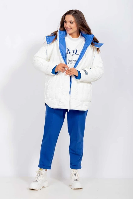 а женская утеплённая осень-зима, прямого силуэта, со спущенными плечами, выполнено из ткани «лаке» стёганная на утеплителе изософт, с капюшоном. По переду косые подрезы и фигурные накладные карманы. По спинке кокетка. Застёгивается куртка на молнию. Воротник стойка. Рукава одно шовные втачные. Подкладка простёгана с утеплителем изософт.