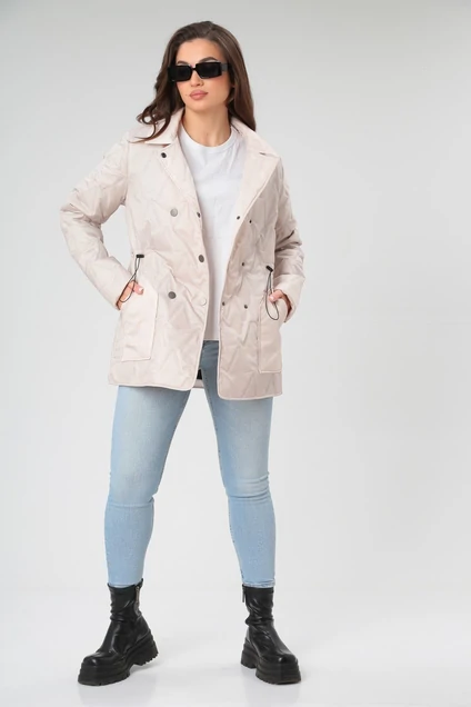 Куртка стеганная утепленная (синтепон 100гр/м2) на подкладке. Модель свободного кроя с центральной двубортной застежкой на кнопки, отложным воротником и лацканами. По переду – фигурные накладные карманы. Спинка цельная. Рукав длинный втачной. По линии талии идет кулиса со вставленной круглой эластичной резинкой и фиксаторами для стягивания. Рассчитано на температурный режим от 0 до +15 (указанная температура комфорта может зависеть от индивидуальной восприимчивости к холоду). На модели размер 46 (параметры модели ОГ-92, ОТ-72, ОБ-102 рост 173см)