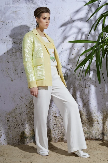 Стильная комбинированная куртка-кардиган в стиле Casual прямого силуэта на вискозной дизайнерской подкладке, длиной до середины бедра. Изделие с центральной застежкой на пуговицы. По переду отрезная широкая планка из отделочной ткани, которая переходит в воротник. Воротник пиджачного типа. Фигурная линия плеча, длинный спущенный рукав с притачной манжетой из отделочной ткани. Куртка с накладными карманами с клапанами из основной ткани. Спинка прямая. Низ изделия на широкой планке из отделочной ткани. Наполнитель izosoft 50мг/м
