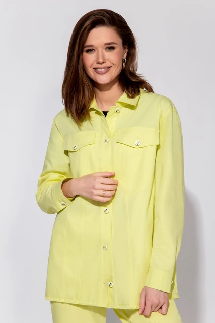 Куртка из хлопковой джинсовой ткани прямого силуэта, центральной сквозной застежкой на 6 петель и 6 пуговиц, с втачным воротником. Детали переда с кокетками, центральные детали переда с 2-мя вертикальными рельефными швами, на кокетках прикреплены клапаны, в швах притачивания кокеток обработаны карманы. Деталь спинки жакета с отрезной кокеткой, центральная часть с рельефными швами. Рукава втачные двухшовные, с притачными манжетами, манжеты с застежкой на 1 петлю и пуговицу. длина рукава - 55м, ширина рукава – 21см, длина спинки – 70см.