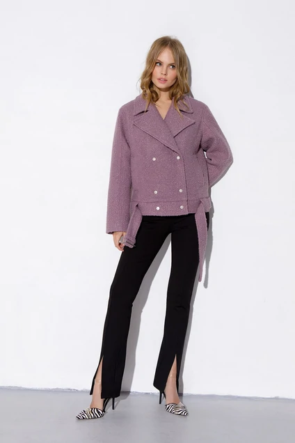 Куртка свободного покроя из фактурной ткани. Детали: прямой силуэт, спущенная линия плеча, смещенные рельефы с нагрудными вытачками и функциональными карманами, кокетки переда и спинки, длинные рукава, смещенная застежка на кнопки