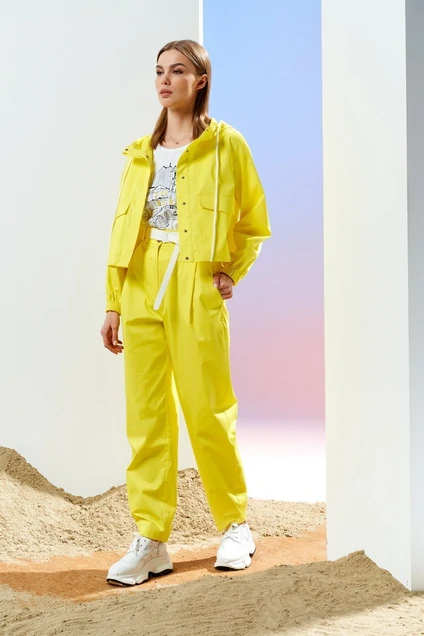 Куртка с капюшоном, прямого свободного силуэта, со спущенной линией плеча. Застежка на кнопки, скрытые под планкой, спереди имеются функциональные накладные карманамы с клапанами, в капюшон вставлен стягивающий шнурок. Рукав длинный, низ оформлен резинкой. Спинка декорирована оригинальными встречными скадками.
