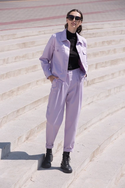 Куртка прямого силуэта со спущенным плечом, втачным рукавом, внизу на манжете. Застёжкой на притачную планку петли-пуговицы. Полочка с крупными накладными карманами с клапаном. . Воротник-стойка. По низу куртки втянут шнурок.