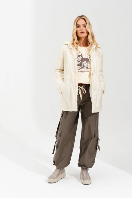 Куртка с отложным воротником из плащевой ткани на синтепоне isosoft 100 г\м , спущенной линией плеча и центральной застёжкой по планке на кнопки. По переду прорезные карманы с листочкой. Куртка на подкладке. Пояс из основной ткани.
