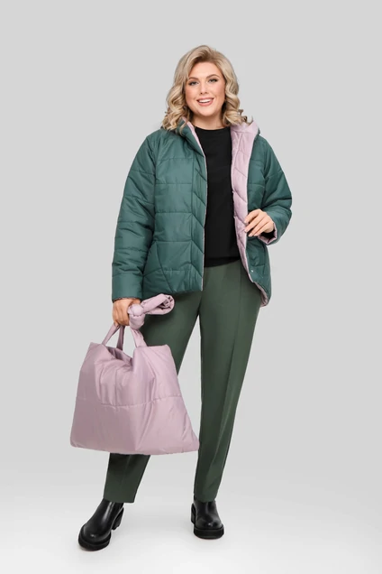 Двухсторонняя дутая куртка на синтепоне, выполненная из плащевой ткани с горизонтальной стежкой. Застежка с центральная с планкой на металлические кнопки. Есть капюшон. Рукав втачной. Одна сторона куртки имеет прорезные карманы с широкими листочками, другая сторона куртки имеет накладные крупные карманы квадратной формы. Длина изделия по спинке от шва втачивания капюшона 72 см. Длина рукава 63см.