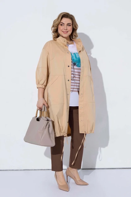 Ветровка женская овального силуэта, выполненная из плотной плащевой ткани. По переду есть крупные накладные карманы с диагональной линией входа в карман, которая обрамлена листочкой. Застежка с широкой планкой на металлические установочные кнопки. Воротник стойка. Покрой рукава на основе рубашечного со спущенной линией плеча. По низу рукава есть притачная манжета с эластичной тесьмой внутри. По низу ветровки есть кулича со шнуром. На спинке есть отлетная кокетка, как в тренчкоте. Изделие без подкладки.
