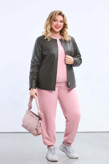 Куртка женская полуприлегающего силуэта, выполненная из экокожи. Застежка центральная бортовая на металлическую тесьму-молнию. Вырез горловины округлый. Рукав втачной, по низу рукава неширокая притачная манжета. По переду куртки есть парные косые подрезы, в одном из которых располагаются карманы. Также вдоль застежки и горловины есть отрезная неширокая планка. Спинка со средним швом и вертикальными рельефами из плечевых швов. Куртка на подкладке.