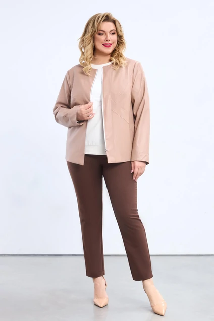 Куртка женская полуприлегающего силуэта, выполненная из экокожи. Застежка центральная бортовая на металлическую тесьму-молнию. Вырез горловины округлый. Рукав втачной, по низу рукава неширокая притачная манжета. По переду куртки есть парные косые подрезы, в одном из которых располагаются карманы. Также вдоль застежки и горловины есть отрезная неширокая планка. Спинка со средним швом и вертикальными рельефами из плечевых швов. Куртка на подкладке.