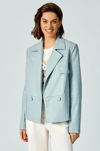 Жакет из экокожи на подкладке. Воротник пиджачного типа, застежка двубортная на пуговицы. Рукав втачной. Ассиметрично на передних полочках расположены функциональный карман и клапан.