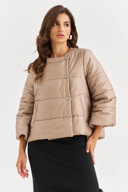 Куртка свободного кроя, длиной выше бедер, по спинке удлинена. Куртка на синтепоне с горизонтальной стежкой. По переду прорезные карманы с листочкой. Рукава одношовные, втачные, длиной 7/8. Горловина округлой формы, без воротника. По переду двубортная застежка на кнопки.