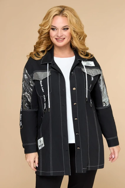 Жакет женский, прямого силуэта, со спущенной плечевой линией. Горловина с втачным воротником, со съёмным капюшоном. Жакет с центральной бортовой застёжкой с планкой на петли и пуговицы. Полочки жакета с горизонтальными кокетками и вертикальными рельефами от них. В швах притачивания кокеток декоративные клапаны, застёгивающиеся на петлю и пуговицу и накладные карманы. В боковой части переда обработаны прорезные карманы с листочкой. Спинка с горизонтальной кокеткой и вертикальными рельефными швами. Рукав длинный, на притачной манжете. Отделкой жакета служат вставки из отделочной ткани на рукавах.