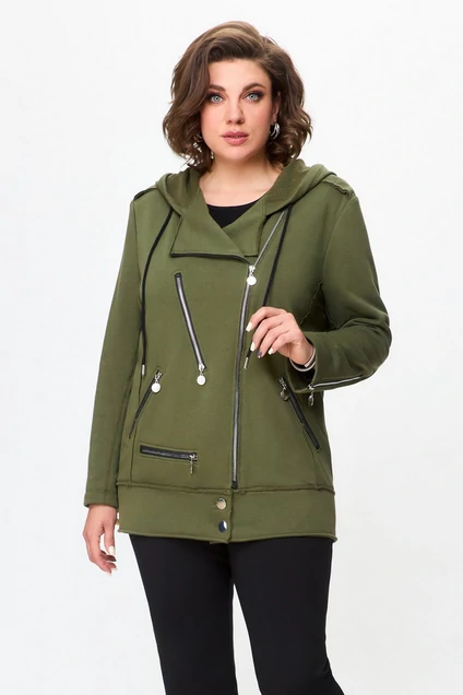 Куртка женская из хлопкового трикотажного полотна прямого силуэта, слегка зауженная к низу. Застежка ассиметричная на молнию с лацканами. Горловина с капюшоном на кулисе. По переду два прорезных кармана на молнии и две декоративные молнии. Боковая деталь переходит в рельефы по переду и спинке. По низу куртки притачной пояс с застежкой на две петли и пуговицы. По спинке кокетка. Рукав втачной длинный, двухшовный с застежкой молнией по низу. Нижние срезы куртки, кокетки, срезы рельефов и рукавов не обработаны. Куртка без подкладки.