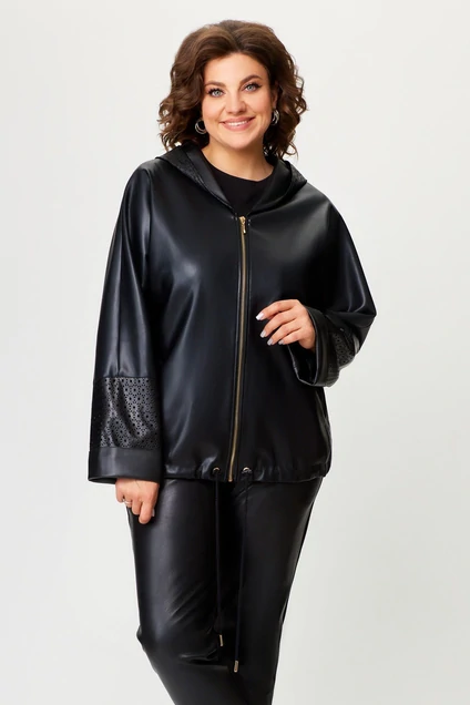 Куртка женская из эко-кожи прямого силуэта с цельнокроеным рукавом. По горловине капюшон. Застежка на молнию. По переду два прорезных кармана с листочками. По низу куртки кулиса. По низу рукава отложная манжета. Нижняя деталь рукава и верхний капюшон из перфорированной кожи. Куртка на подкладке.