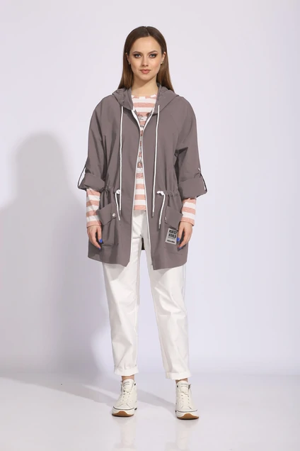 Ветровка женская, прямого силуэта, объемная с регулируемой кулисой по талии. Рукав реглан, длинный, длина регулируется патой, закрепленной на петлю и пуговицу. Горловина оформлена капюшоном с кулисой по краю. Застежка спереди, центральная на молнию. По переду накладные карманы с клапанами. Клапаны закреплены на петли и пуговицы. Декором служит декоративная нашивка на кармане. Длина 77 см, длина рукава 78 см.