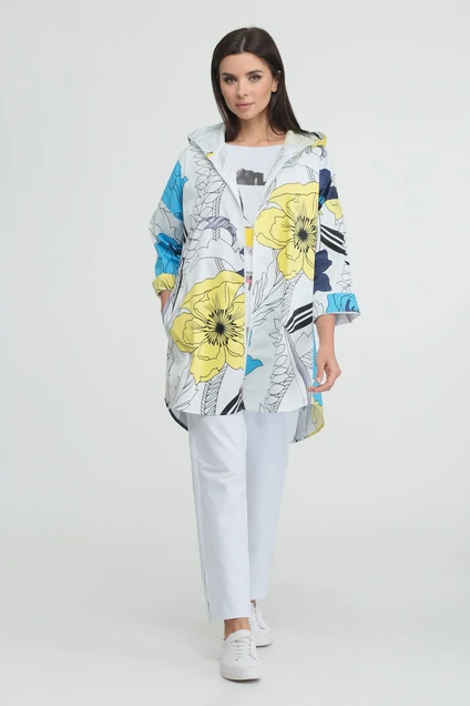 Куртка без подкладки из ткани с хлопком, удлиненная, со спущенной линией плеча, капюшоном, карманами в боковых швах, фигурным низом, на застежке-«молния». Спинка с притачной кокеткой и складкой по центру. Рукав втачной одношовный, с широкой подгибкой для отворота. Вырез горловины круглый.