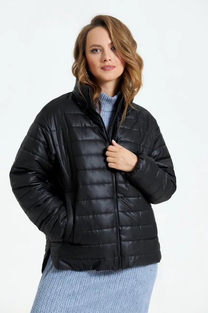 Куртка утепленная из плащевой стеганной ткани. Перед и спинка прямые, со скругленными разрезами по бокам, спинка чуть удлиненная. Карманы с листочками по бокам. Рукава на спущенной пройме прямые, внизу на резинке. Застежка на молнию. Воротник-стойка.
