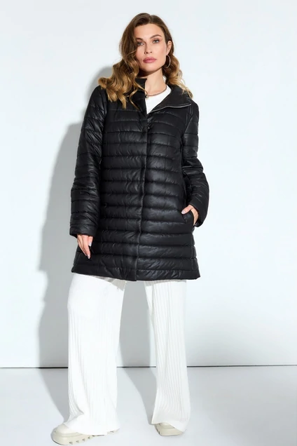 Куртка из стеганной ткани на синтепоне. Втачной длинный рукав. Слегка расширенный к низу силуэт. Застежка на потайные кнопки и молнию. Воротник-стойка переходящий в капюшон. Карманы прорезные в бочках.