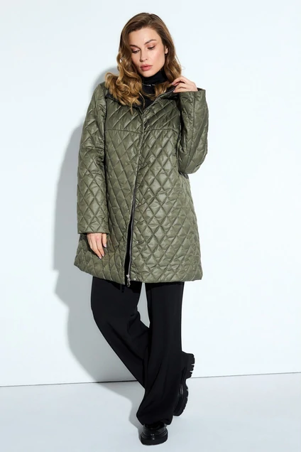 Куртка из стеганной ткани на синтепоне. Втачной длинный рукав. Слегка расширенный к низу силуэт. Застежка на потайные кнопки и молнию. Воротник-стойка переходящий в капюшон. Карманы прорезные в бочках.