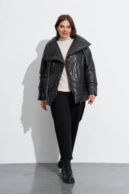 Куртка на утеплителе с ассиметрично расположенной застёжкой. На деталях переда обработаны: накладной карман справа и карман в рельефе слева. Застёжка из открыто настроченной молнии. Объёмный воротник-стойка подвязывается слева у плеча . Рукава одношовные, с декоративными строчками. Изделие на подкладке.