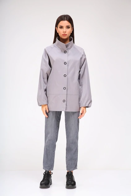 Куртка женская прямого свободного силуэта(oversize) из плащёвой ткани(на подкладке). По переду вертикальные рельефы, идущие от проймы до низа изделия; в рельефах карманы; горизонтальные рельефы по линии талии(от входа в карман до края борта). Воротник - высокая стойка. По спинке: рельефы от проймы до низа изделия и горизонтальный в области линии талии; все рельефы с отделочной строчкой; по низу эластичная тесьма. Рукав – реглан с рельефами по переду и сзади; на эластичной тесьме по внутренней части.