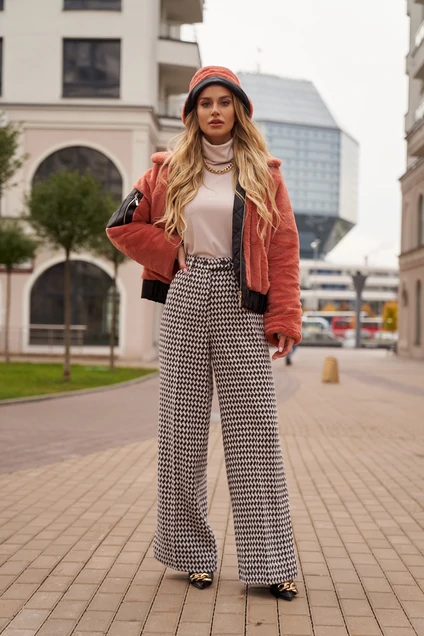 Куртка из меха в сочетании с кожей, свободного кроя, с застежкой на молнию. По переду обработаны карманы. По низу притачная манжета с резинкой. Рукава реглан. На правом рукаве обработан декоративный карман. Воротник отложной на стойке. Изделие на утепленной подкладке.  Длина 58 см, рукав 64 см.