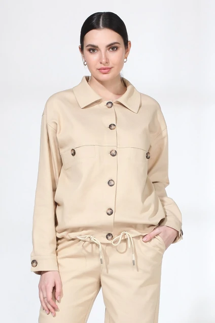Джинсовая куртка прямого силуэта. Застежка центральная на пуговицы. Спинка декорирована печатью. Спереди карманы, застегивающиеся на пуговицы. Низ куртки на спинке с эластичной тесьмой, спереди регулируется шнуром. Длина куртки - 63 см.