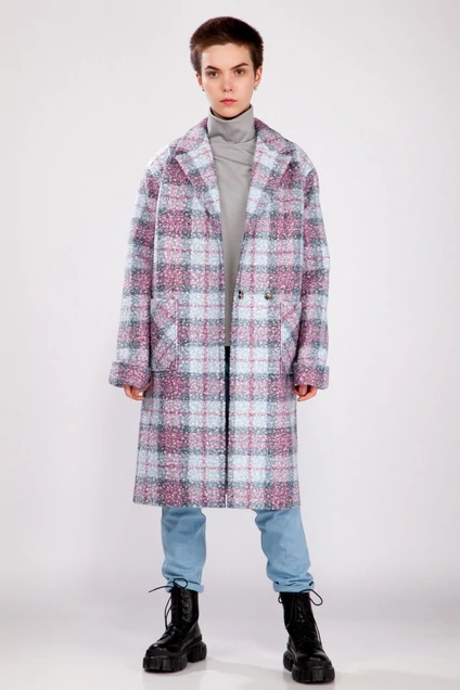 Демисезонное пальто свободного кроя с отложным воротником. По переду накладные карманы. По спинке средний шов. Рукав втачной длинный одношовный прямой, со спущенным плечевым срезом, по низу - с отложной манжетой, длина рукава легко регулируется с помощью отворота. В комплект входит съемный пояс из основной ткани. Длина по спинке: 102 см