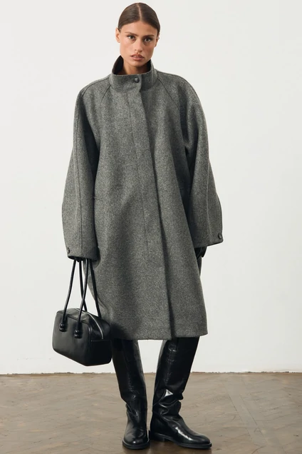 Пальто шерстяное свободного силуэта с широким рукавом. Изделие со спущенным плечом и широкой проймой. По переду изделия карманы с листочкой. Воротниик стойка. Застежка с планкой на потайной пуговице.