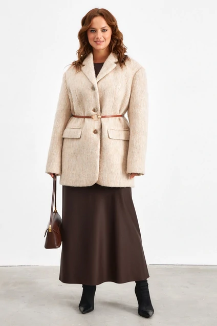 Жакет-пальто. Жакет однобортный, по переду застежка на пуговицы, в комплекте ремень. По бокам функциональные карманы с клапаном. Создано из высококачественных материалов.
