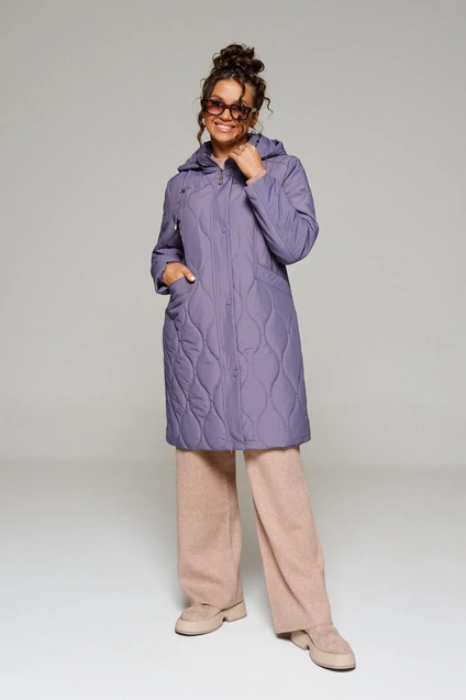 Пальто выполнено из стёганной, достаточно прочной и приятной на ощупь влагостойкой, полиэфирной ткани; на синтетической подкладке. Лёгкий утеплитель из холлофайбера 150 г/м.кв.; подходит для холодной осени и весны. Изделие рассчитано на температурный режим от +5 до -10 градусов. Модель прямого силуэта, базового кроя; предназначена для повседневного использования. Передняя часть с отрезной кокеткой в верхней части и с двумя декоративными рельефами, в нижней части которых предусмотрены горизонтальные карманы, а также два дополнительных, вертикальных на молнии. Застежка центральная на декоративную молнию с ветрозащитной планкой снаружи, которая фиксируется на кнопки. Длина молнии от верхней части капюшона до нижнего края изделия. Спинка с двумя отрезными кокетками в верхней части и с двумя вертикальными рельефами. Рукав длинный, двухшовный, втачной. Капюшон притачной по линии горловины.
