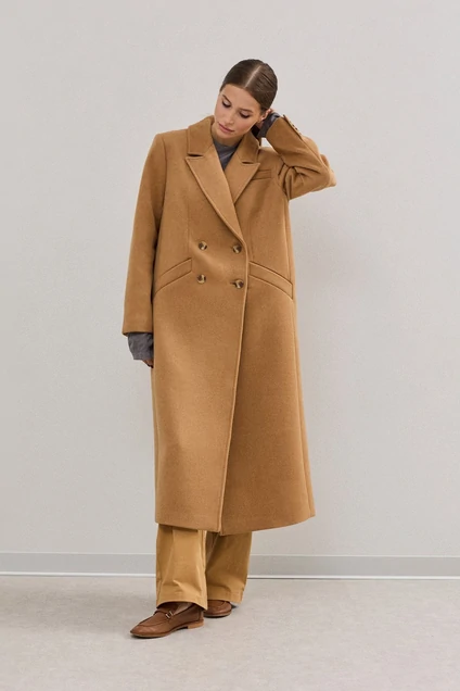 Пальто женское двубортное , выполнено из пальтовой ткани великолепного качества . Рукав втачной двухшовный , воротник стояче-отложной с отворотами лацканов. По переду прорезные карманы.Сзади по среднему шву - шлица. Подкладка полиэстер 55%, вискоза 45%.