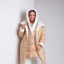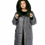 Пальто женское полуприлегающего силуэта, с центральной застежкой на тесьму-молнию и планку (потайные кнопки). Карманы в рельефах с отрезной листочкой (на листочке отделочные кулисы, протянут шнур - резинка с фиксатором) . Спинка с отрезными бочками , по низу рельефов шлицы с застежкой на кнопки. Рукав втачной, одношовный с отделочным манжетом по низу (довяз). Воротник- стойка, нижний воротник из отделочной ткани (довяз). Капюшон объемный (на кнопках) с центральной частью и с отделочной частью по отлету, с застежкой на кнопки. В качестве отделки используется фурнитура и детали. Длина по спинке 109 см. , длина рукава 63 см.