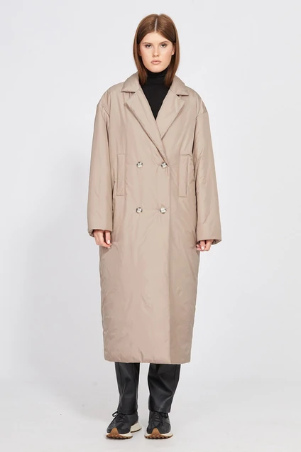 Пальто выполнено из плащевой ткани, утепленной изософтом. Пальто прямого силуэта, длиной до середины икры. Спереди двубортная застежка на два ряда пуговиц и прорезные карманы с листочками. Спинка со средним швом. Плечевой шов спущен. Воротник пиджачного типа. Рукав рубашечного покроя, двухшовный. Пальто на притачной по низу подкладке.