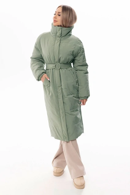 Пальто на утепленной подкладке. Пальто утепленная, с центральной застежкой на молнию, с высоким воротником- стойкой, планкой, застегивающейся на кнопки. На полочках расположены прорезные карманы с листочками. Рукав втачной, с отрезной манжетой. Манжета присборена на резинку. Плечо спущенное. Пальто со съемным поясом.
