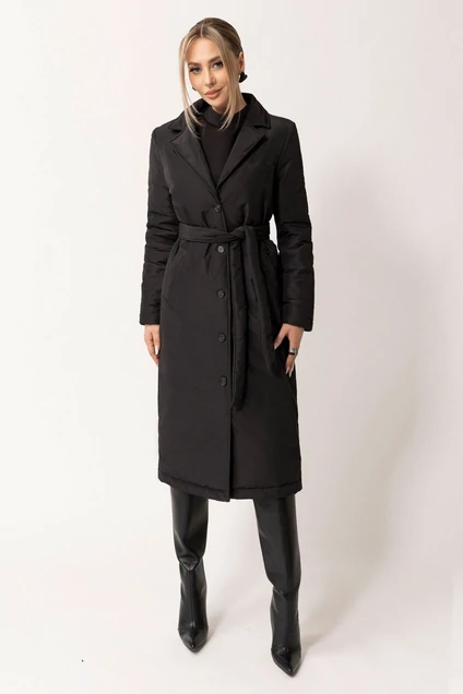 Пальто утепленное с втачным воротником и отложными лацканами, центральной застежкой на пришивные кнопки. На полочках , на уровне груди и на уровне бедер прорезные карманы с листочками. Спинка со средним швом. Рукав втачной, длинный. Пальто со сьемным поясом.