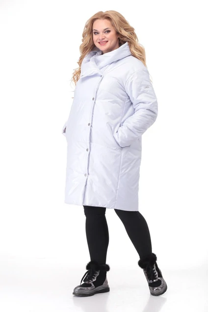 Перед и спинка пальто с двумя горизонтальными фигурными рельефами, и переходящими бочками. По передней линии бочков карманы с потайной молнией. Пройма спущена, рукав втачной двухшовный. Застежка на кнопки, двухбортная.