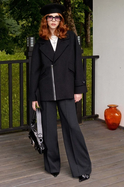 Пальто свободного кроя, укороченное, выполнено из пальтовой ткани на подкладке. Рукав-реглан длинный, по низу рукава пата, фиксирующаяся на пуговицы. Воротник пиджачного кроя с воротником и лацканом, застёжка двубортная на металлическую молнию. По спинке средний шов.