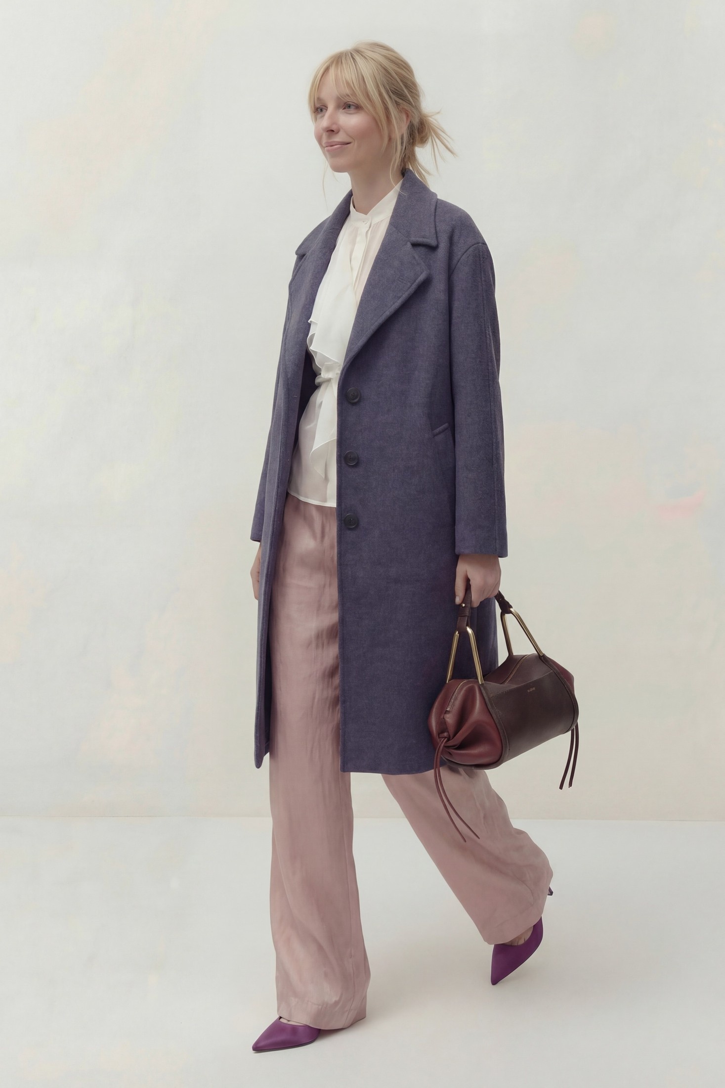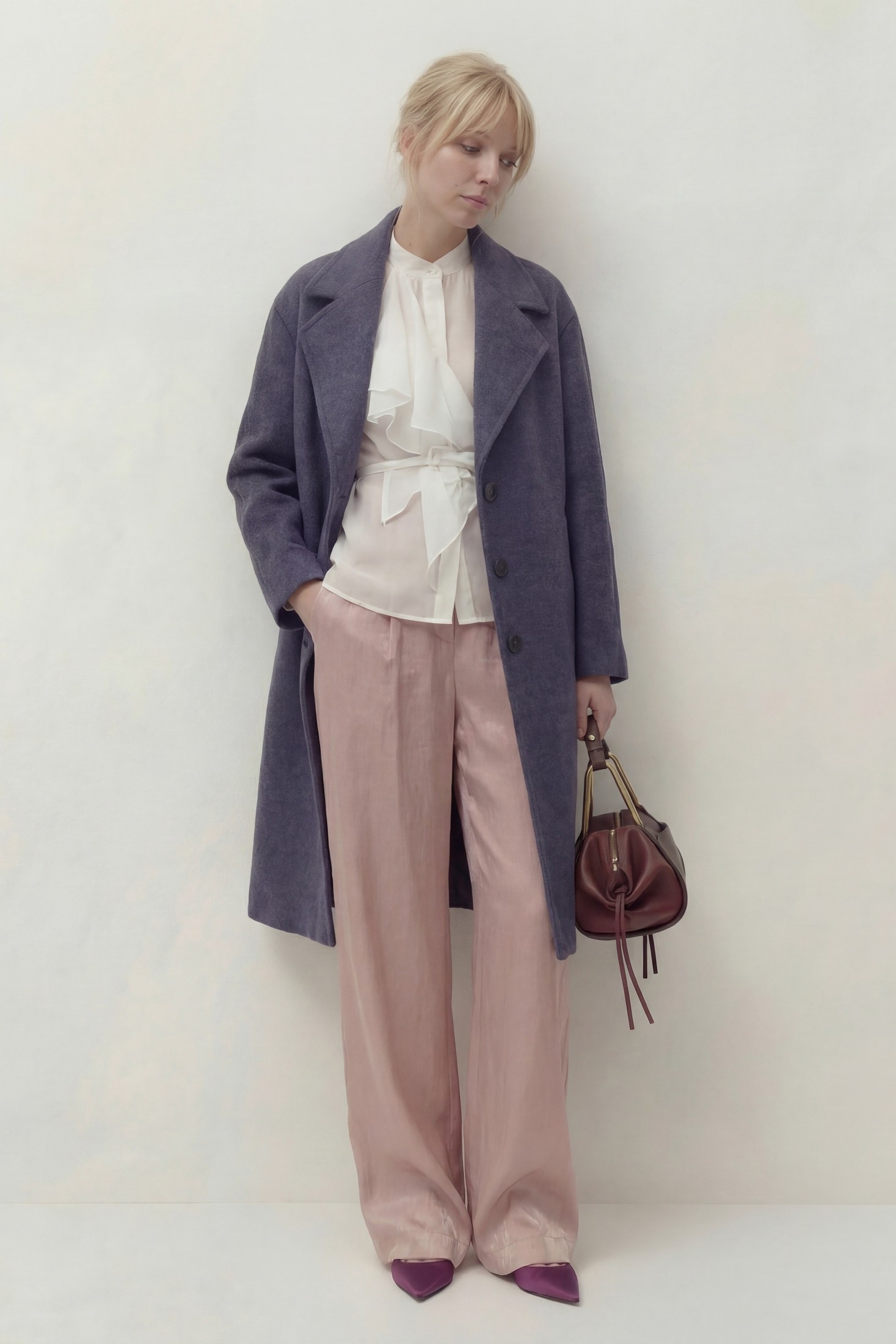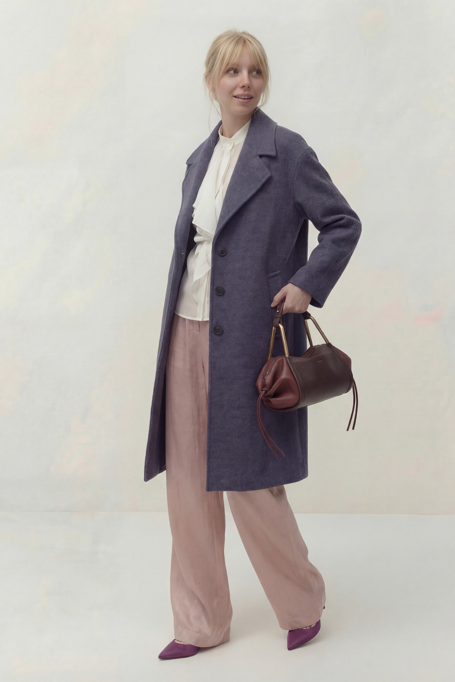 Пальто свободного кроя на подкладке. Линия плеча спущена, рукав длинный. Воротник пиджачного типа, застежка центральная на петли и пуговицы, в боковых швах карманы.