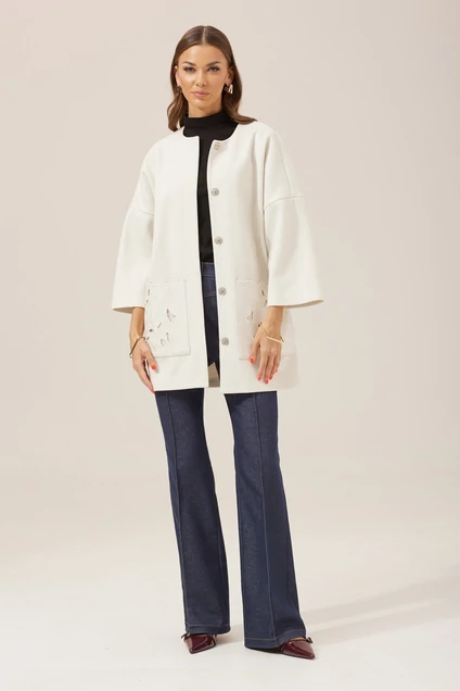 Кардиган прямого силуэта из трикотажного полотна. Горловина округлая. По центру застежка на кнопки. Рукав со спущенной линией плеча, длиной 7/8 . По переду накладные карманы с дизайнерской вышивкой. Обращаем ваше внимание, что фурнитура может незначительно отличаться от фото. Длина кардигана (44-48р -78см)(50-54р – 80см)(56-60р - 82см)