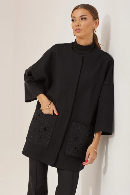 Кардиган прямого силуэта из трикотажного полотна. Горловина округлая. По центру застежка на кнопки. Рукав со спущенной линией плеча, длиной 7/8 . По переду накладные карманы с дизайнерской вышивкой. Обращаем ваше внимание, что фурнитура может незначительно отличаться от фото. Длина кардигана (44-48р -78см)(50-54р – 80см)(56-60р - 82см)